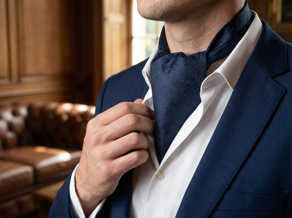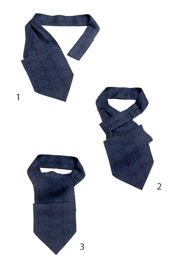 Acest ascot bleumarin cu model paisley impresionează prin nuanța profundă și ornamentul delicat. Modelul se evidențiază discret în lumină, oferind un aer sofisticat.