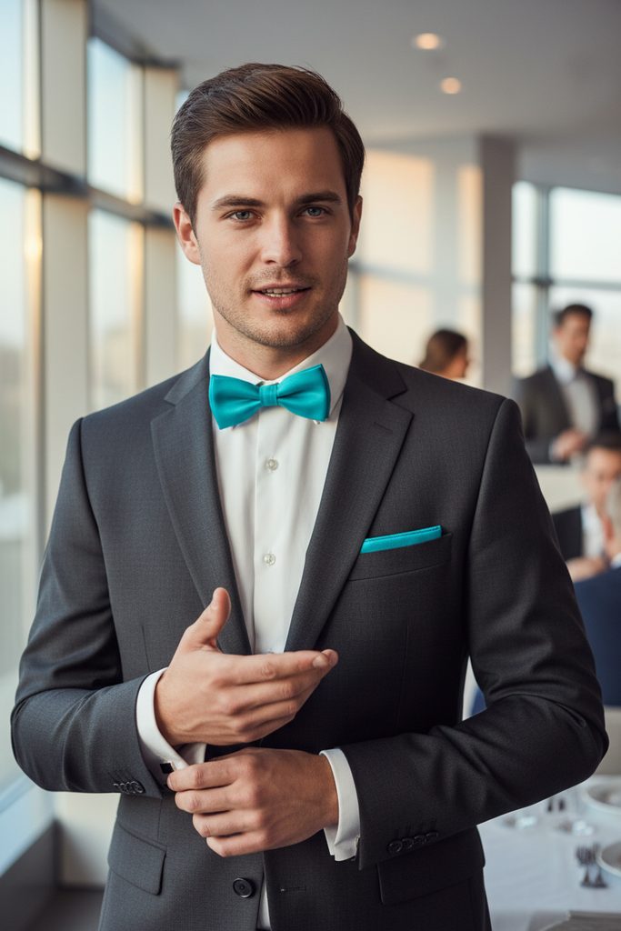 Un papion bărbătesc albastru turcoaz, în set cu o batistă în aceeași culoare (inclusiv batista), este un accesoriu stilat și elegant pentru o cămașă bărbătească.