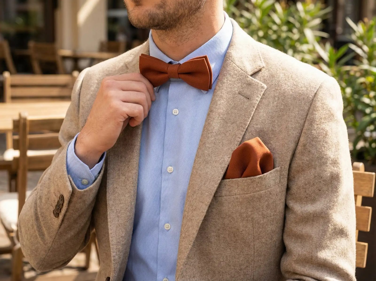 De exemplu: o cămașă deschisă la culoare, pantaloni chinos bej, un sacou lejer și un papion din bumbac creează o combinație care arată îngrijit, dar relaxat.