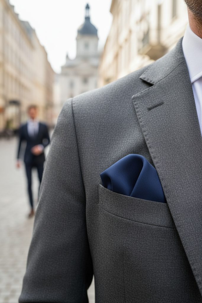 Un accesoriu elegant pentru buzunarul jachetei Batista albastru inchis are dimensiunea de 28x28 cm.