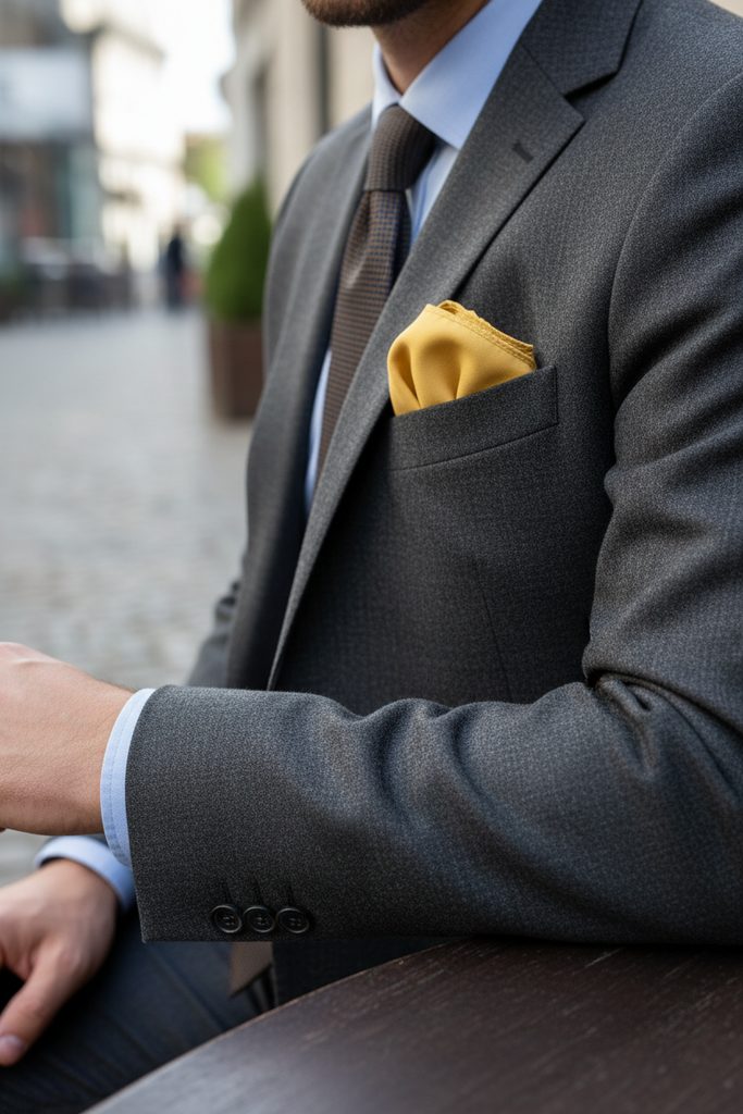 Un accesoriu elegant pentru buzunarul jachetei Batista galbena de culoare mustar are dimensiunea de 28x28 cm.