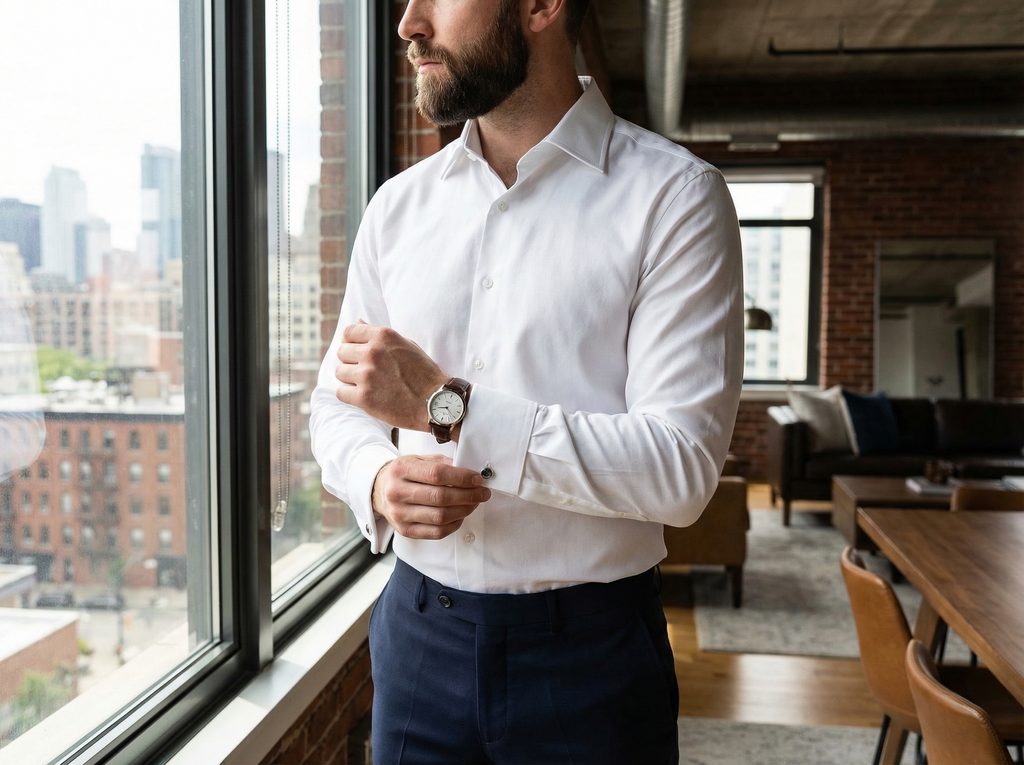 Cămașa albă cu manșete pentru butoni se potrivește foarte bine cu costume în culori închise, precum negru, bleumarin sau antracit. Pentru o apariție de nuntă sau o ocazie festivă poate fi completată cu un papion elegant sau o cravată clasică.