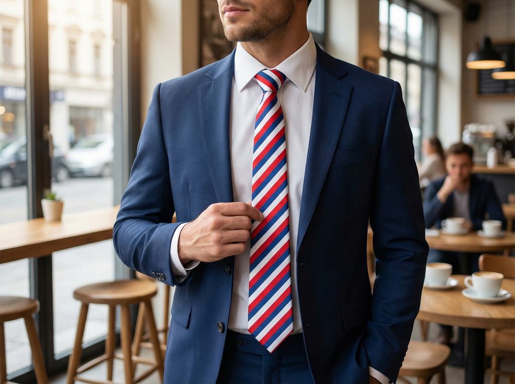 Cravata tricolor arată foarte bine alături de cămașă albă, care evidențiază clar culorile. Pentru o ținută elegantă poate fi purtată cu costum bleumarin, unde modelul devine accentul principal. O combinație echilibrată se obține și cu cămașă albastru deschis și sacou gri, potrivită pentru o apariție formală. Ținuta poate fi completată cu batistă de buzunar pentru sacou sau bretele pentru bărbați, care adaugă un detaliu clasic întregului outfit.