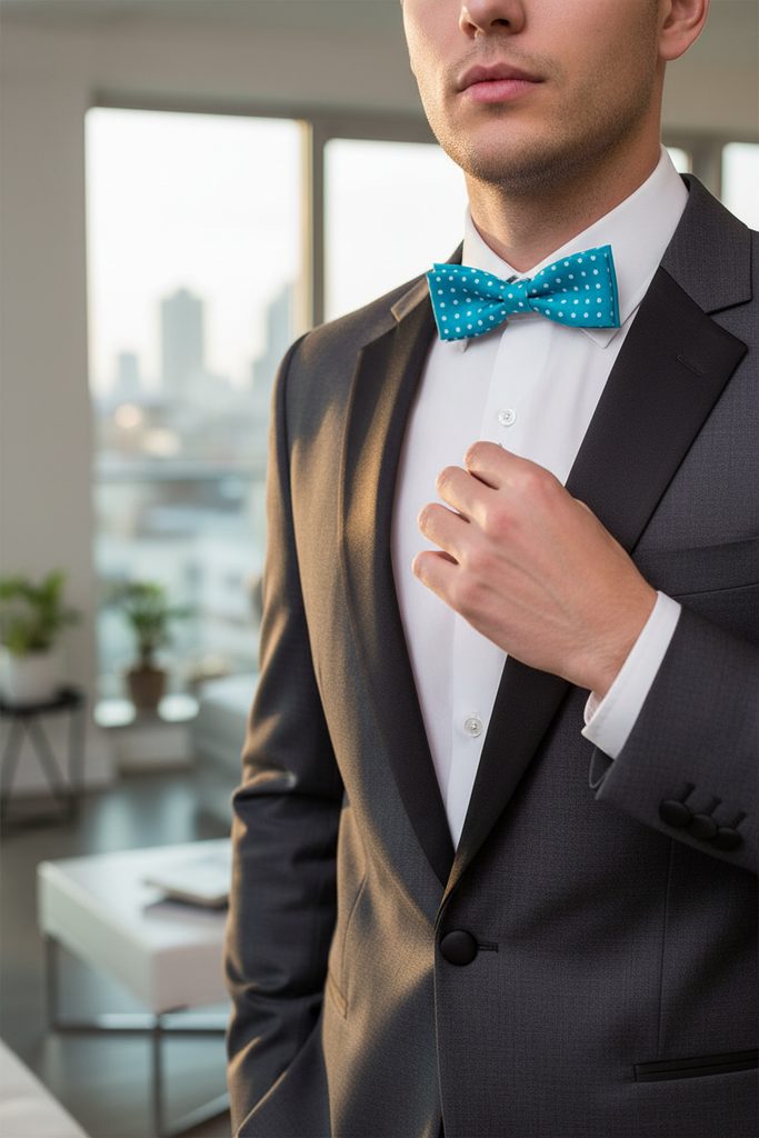 Papion bărbătesc turcoaz, buline albe marimea 10 cm se potrivește perfect cu orice frac sau cămașă smoking. Pe spatele papionului este atașat un cârlig cu ochi, datorită căruia lungimea poate fi ajustată cu ușurință în funcție de circumferința gâtului.