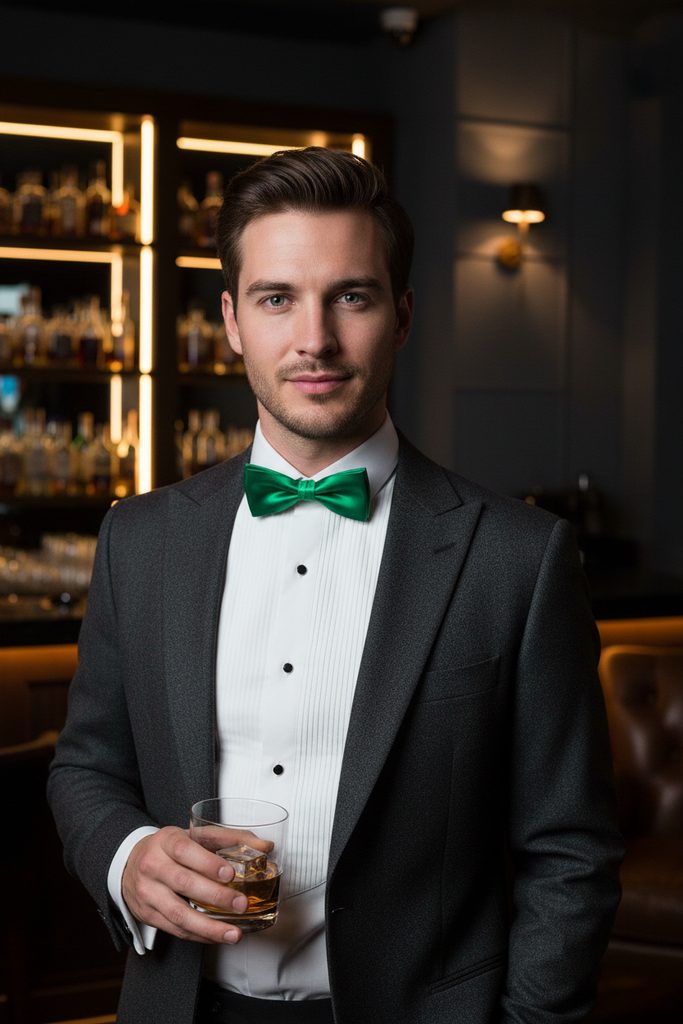 Papion de smarald legat marimea 12,5 cm se potrivește perfect cu orice frac sau cămașă smoking. Pe spatele papionului este atașat un cârlig cu ochi, datorită căruia lungimea poate fi ajustată cu ușurință în funcție de circumferința gâtului.