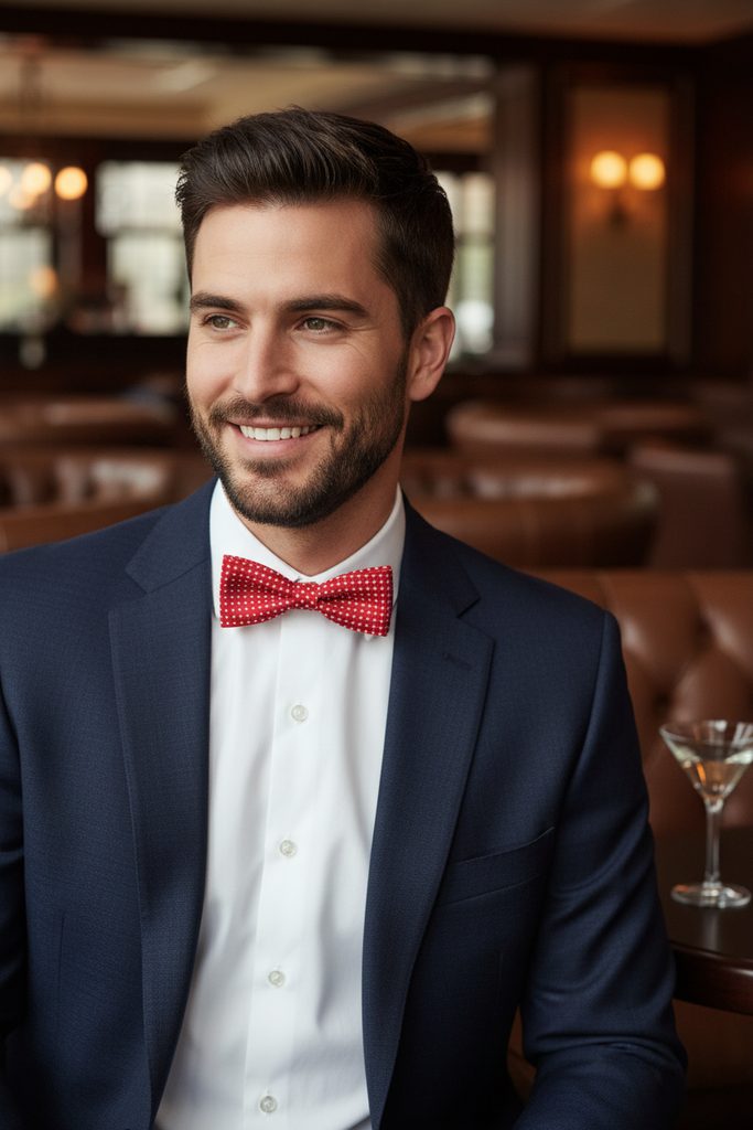 Papion roșu din bumbac 100% steluțe albe marimea 10 cm se potrivește perfect cu orice frac sau cămașă smoking. Pe spatele papionului este atașat un cârlig cu ochi, datorită căruia lungimea poate fi ajustată cu ușurință în funcție de circumferința gâtului.